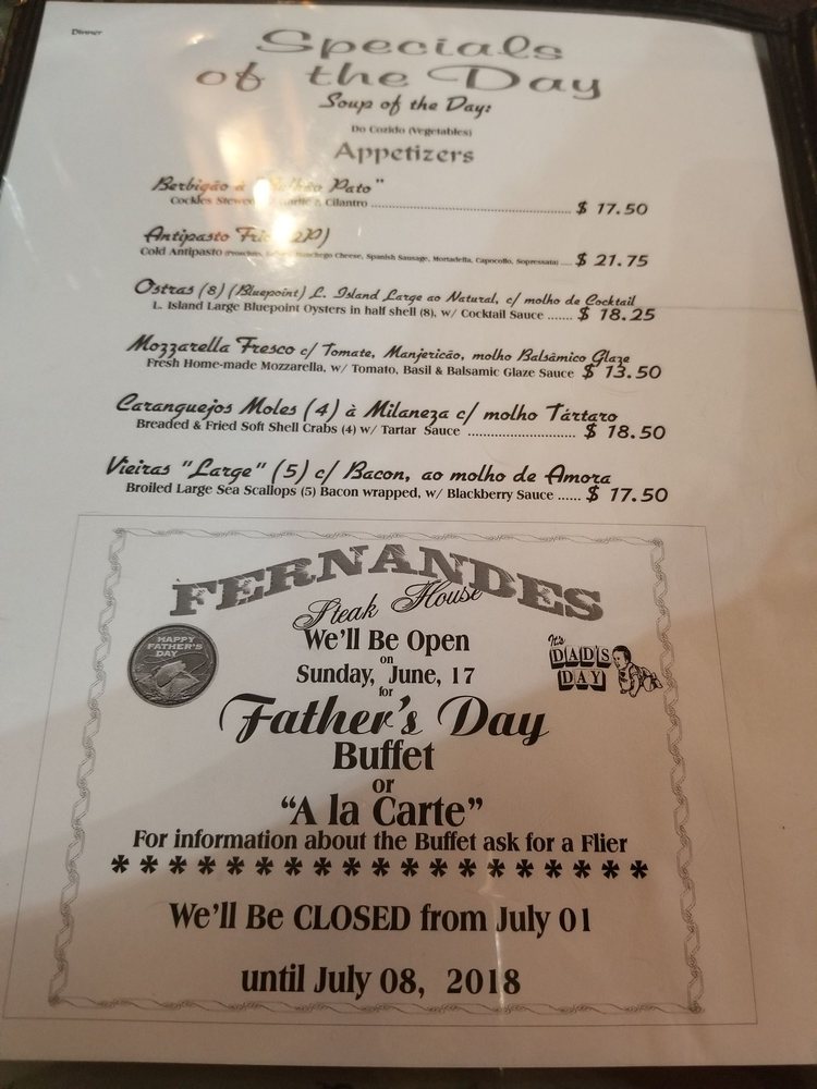 Introducing Fernandes Steak House: Located in Newark, NJ, Fernandes Steak House offers a wide range of options for meat lovers, including grilled steaks, barbecued meats Brazilian style, and broiled filet mignon with lobster tail. The restaurant prides itself on its extensive menu, which also includes seafood appetizers like sautéed shrimp and boiled shrimp cocktails. Customers praise the rodizio experience, with a variety of meats served continuously. The restaurant's staff has been highlighted for their excellent service, adding to the overall dining ambiance. Fernandes Steak House provides a casual yet elegant atmosphere, perfect for group gatherings or a romantic dinner. With options for takeout, delivery, and catering, Fernandes Steak House caters to all dining preferences.